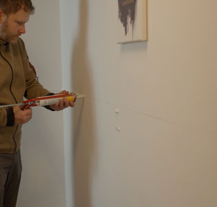 Eine waagerechte Linie auf Höhe der späteren Oberkante anzeichnen und entlang dieser sowie ca. 5 cm über dem Boden den Montagekleber auftragen.