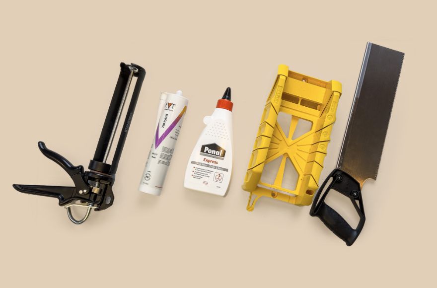 Mit dem Tool-Kit sind Sie für die Montage bestens ausgestattet. Es enthält alle wichtigen Werkzeuge wie Säge, Sägeschablone, Spachtel und Kleberkartusche – genau das, was Sie für eine saubere und einfache Verarbeitung benötigen.